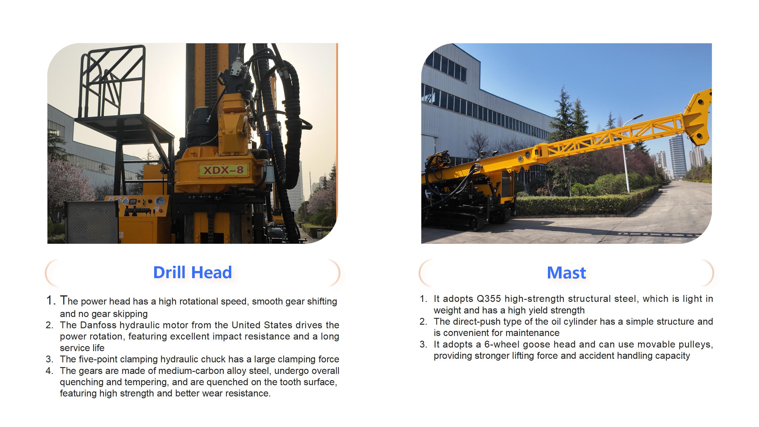 XDX-8 can be applied to both slant and vertical drilling. Being a rig equipped with diamond and the carbide alloy drilling, it can be used in the fields of geology, metallurgy, coal mining, nuke industry and hydrology measuring for wire-line coring and top drive drilling.